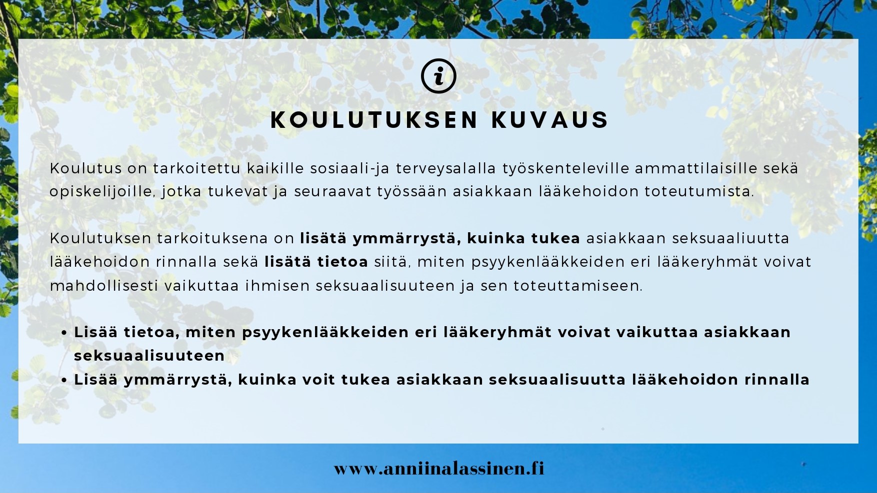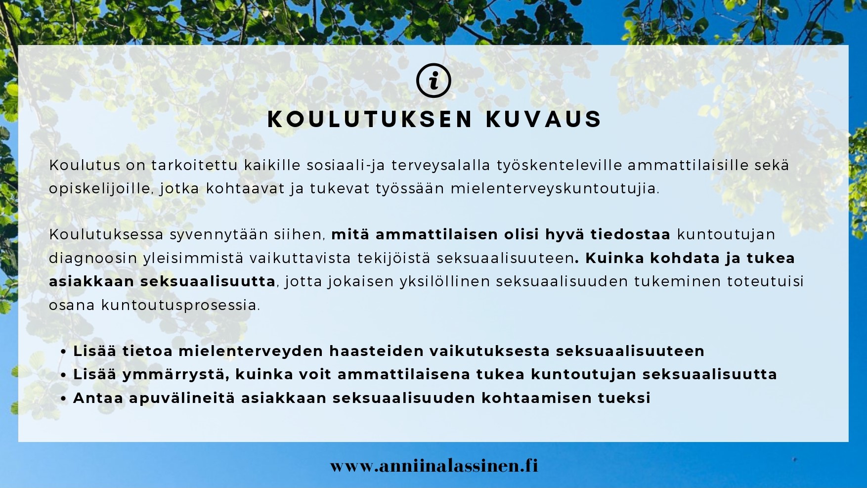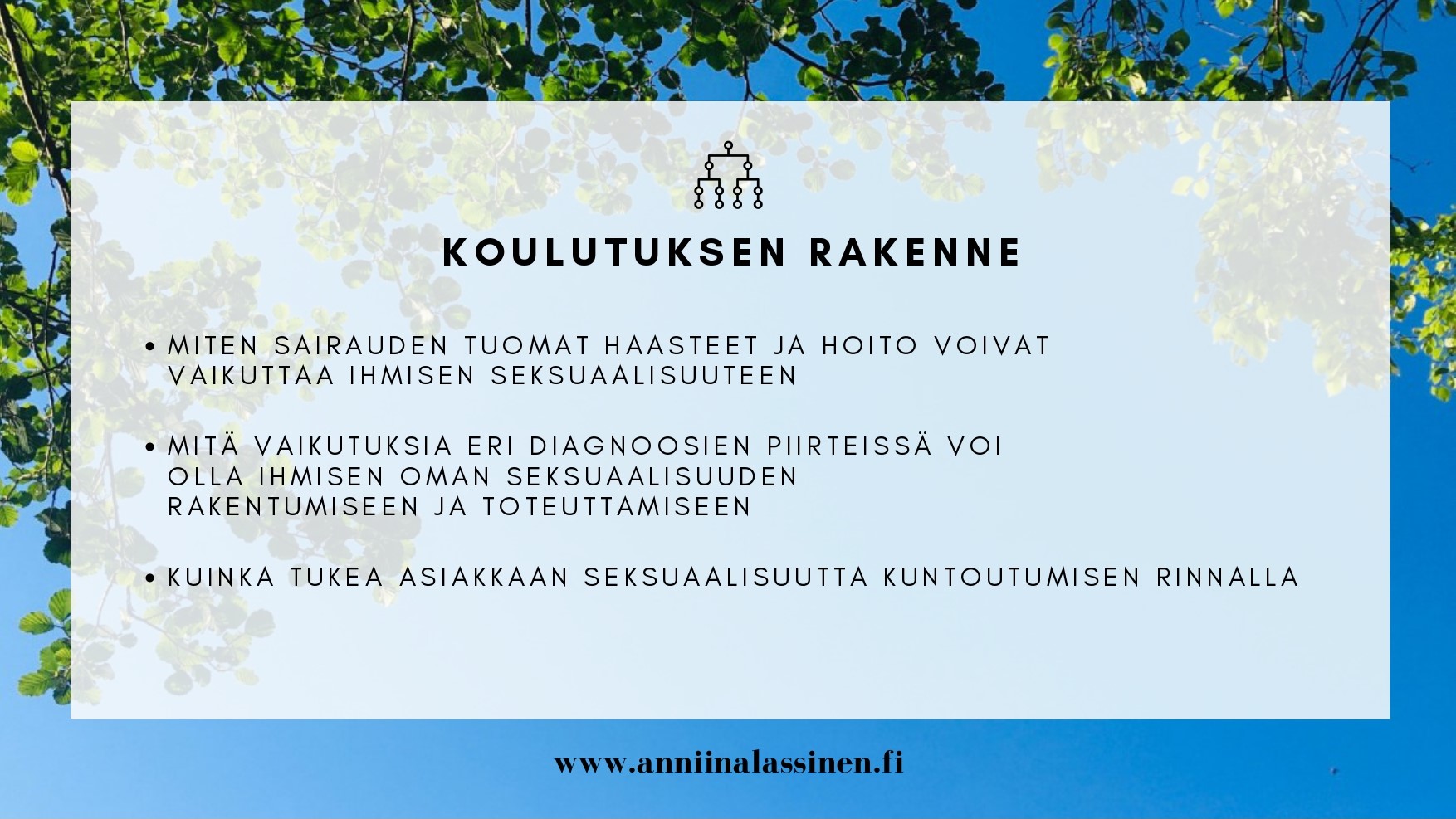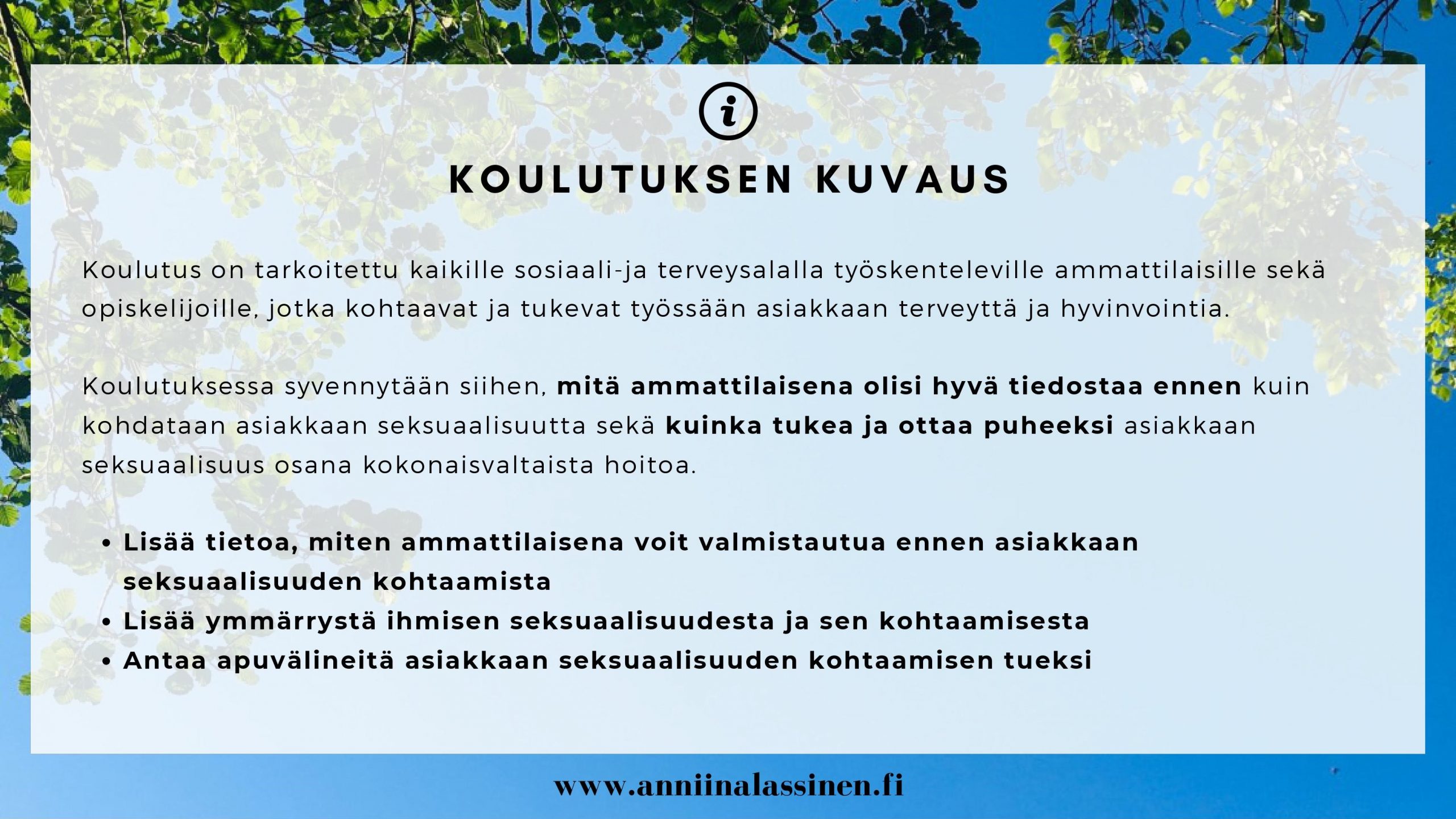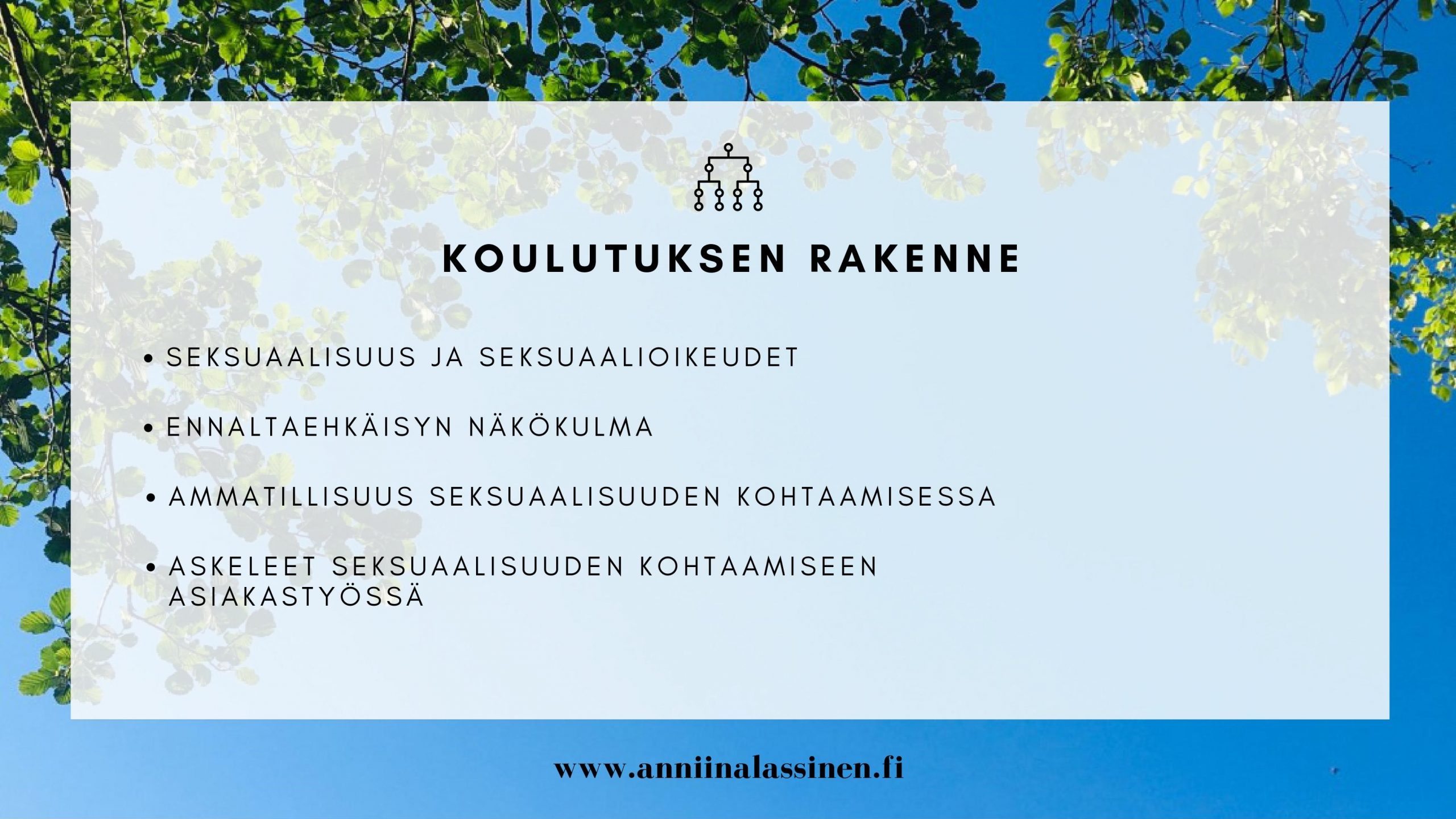 Koulutuksesta kiinnostuneen tahon kanssa on myös mahdollista yhdessä suunnitella koulutuskokonaisuus seksuaalisuuden eri teemoista, yksilöllisen tarpeen mukaisesti.
